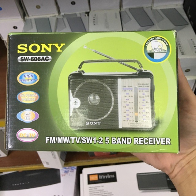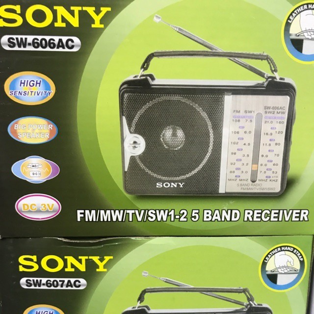 Giới thiệu đài radio SW-606AC: - Kiểu dáng đẹp, nhỏ gọn. - Có quai xách tiện lợi. - Xuất xứ: Trung Quốc. - 5 band: FM, TV, AM, SW1, SW2. - Tần số hoạt động: + FM: 64-108 MHz. + TV: 2-5 CH. + AM: 530-1600 KHz. + SW1: 3.0-7.5 MHz. + SW2: 7.5-21.0 MHz. - AC: 220V/50Hz. - DC: 3V ( UM-1X2 ). - Kích thước (R x D x C): 6 x 16 x 11 cm. - Trọng lượng cả hộp: 500 g.Giá TBC