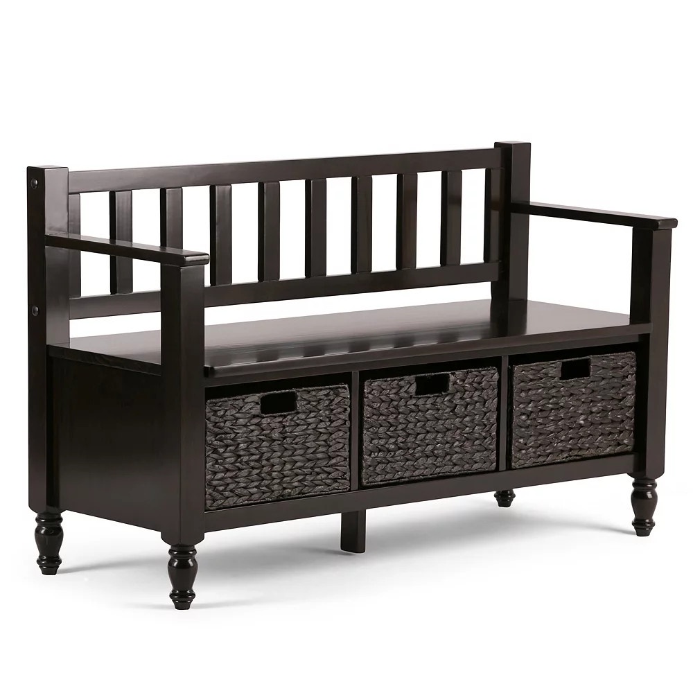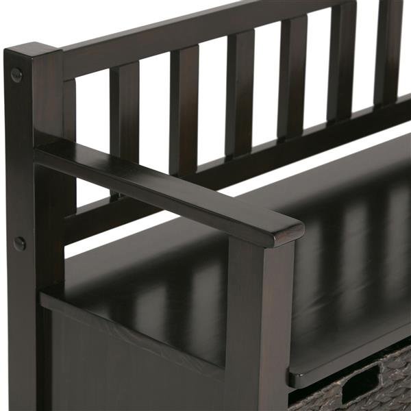 Dakota Entryway Bench có phong cách hiện đại đẹp mắt, tăng thêm sự ấm áp cho ngôi nhà của bạn. Được làm từ gỗ nguyên khối và được nhuộm màu nâu đậm của Exeter tuyệt đẹp, chiếc ghế dài này mang đến cho bạn không gian ngồi thoải mái cho cả hai người. Bên dưới khu vực tiếp khách là một ngăn chứa đồ lớn với ba giỏ lục bình mà bạn có thể sử dụng để đựng giày dép, đồ chơi và nhiều thứ khác.