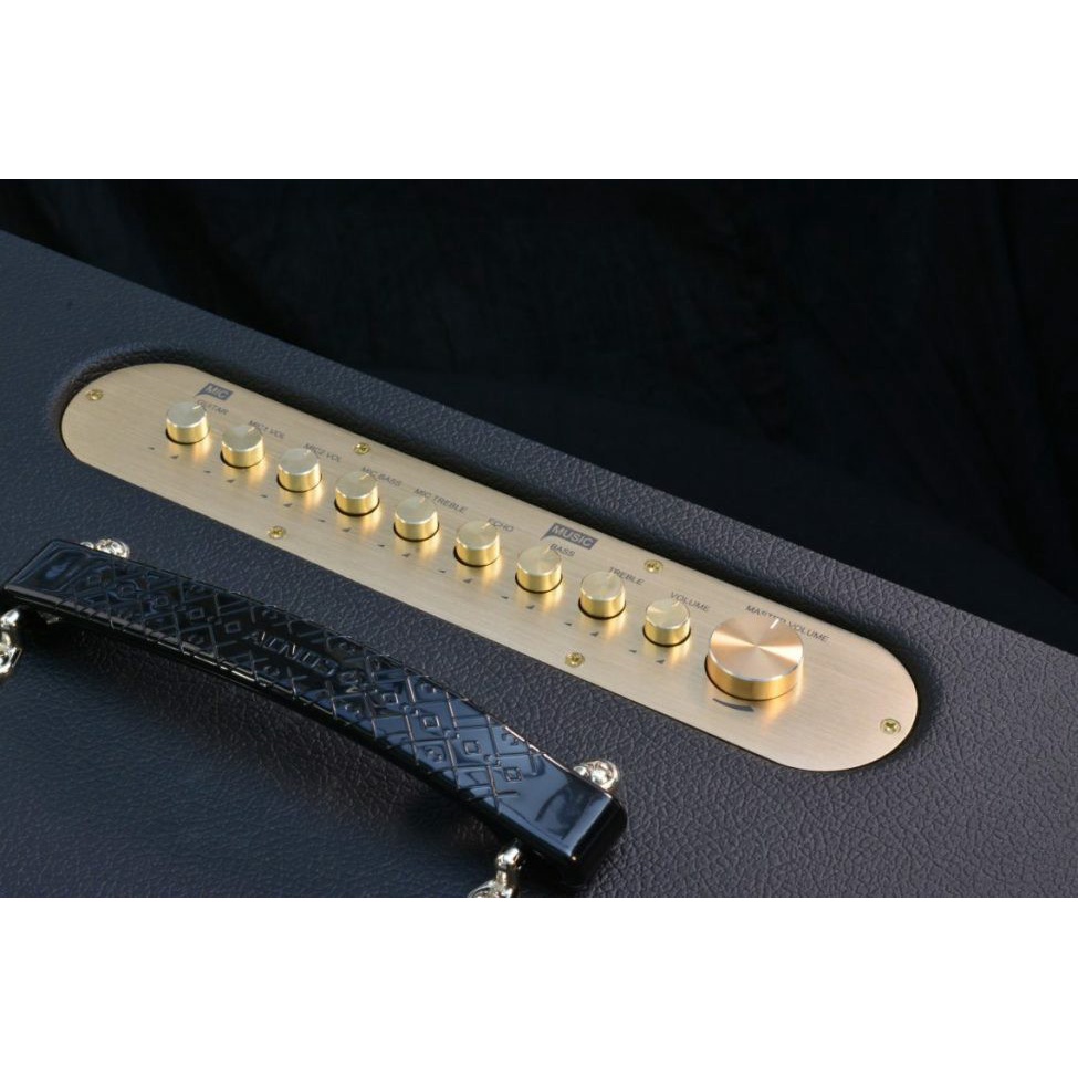 Mặt trên loa được tích hợp các núm vặn cơ bản: guitar vol, mic vol 1, mic vol 2, mic treble, mic bass, echo, bass music, treble music, vol music và Master vol giúp người dùng hiệu chỉnh được nhạc vào và micro một cách dễ dàng và hiệu quả nhất.