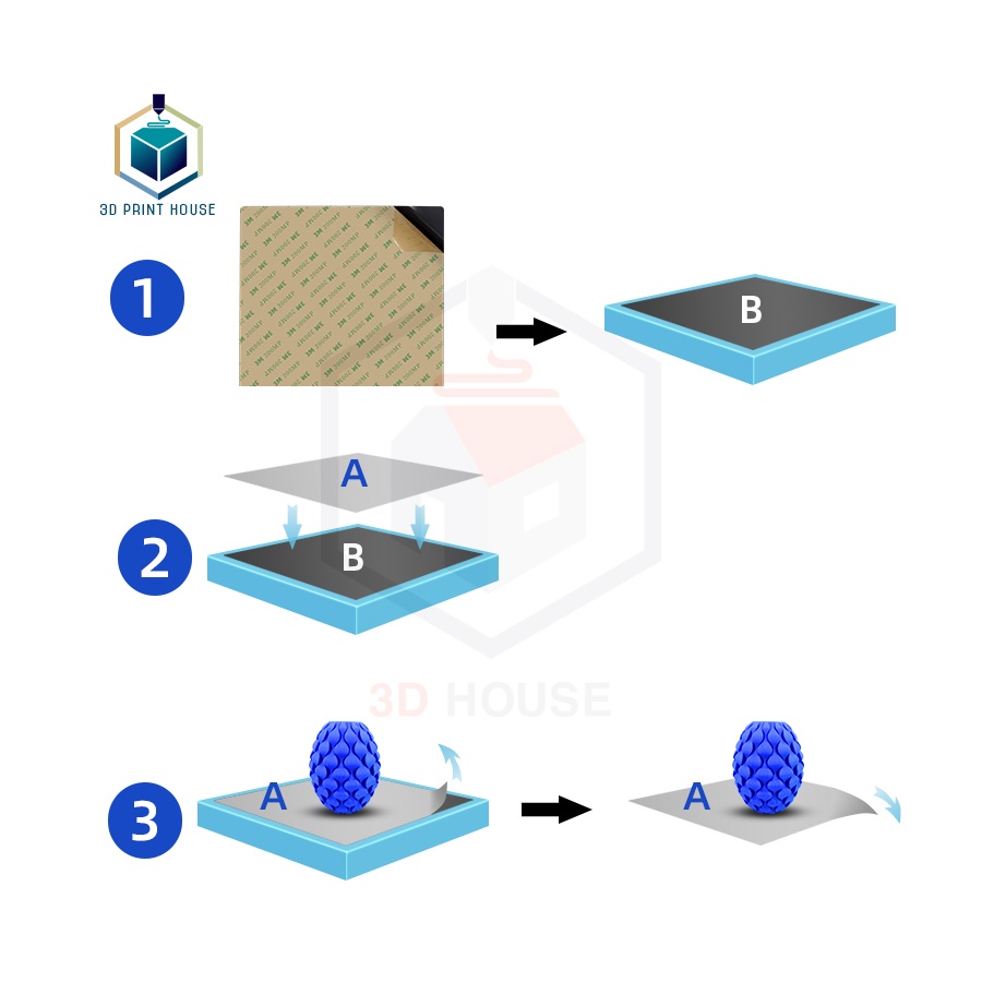 Sản phẩm bao gồm 2 lớp A B, lớp A có lớp keo 3M dùng để dán chặt vào bàn nhiệt, lớp B là lớp bề mặt in nhám giúp bề mặt vật in bám bàn và đẹp hơn. Cả 2 lớp đều tích hợp nam châm nên có thể lấy ra gắn vào thuận tiện cho việc lấy vật in.