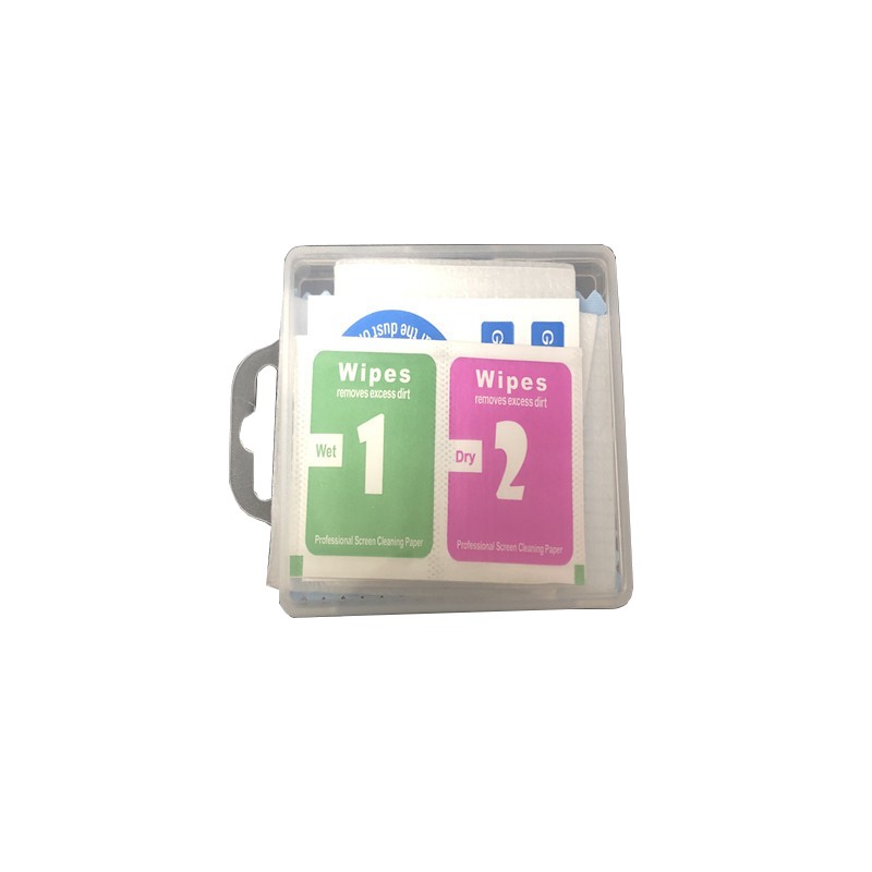- Ngoài ra còn có 2 khăn lau; 1 khăn khô và 1 khăn ướt để bạn có thể lau màn hình trước khi dán miếng dán lên.