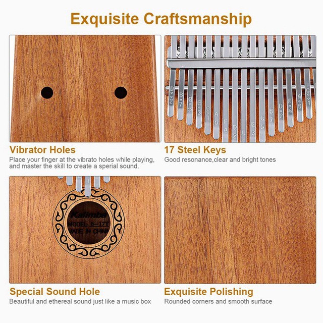 Các phím kim loại của KALIMBA được gắn trên một hộp gỗ nguyên khối đóng vai trò là buồng cộng hưởng. Bạn có thể chơi bài hát dễ dàng bằng cách kéo phím. Một thao tác đơn giản có thể học một phút. Bạn có thể tạo ra âm nhạc tuyệt vời bằng ngón tay cái ở mọi nơi.