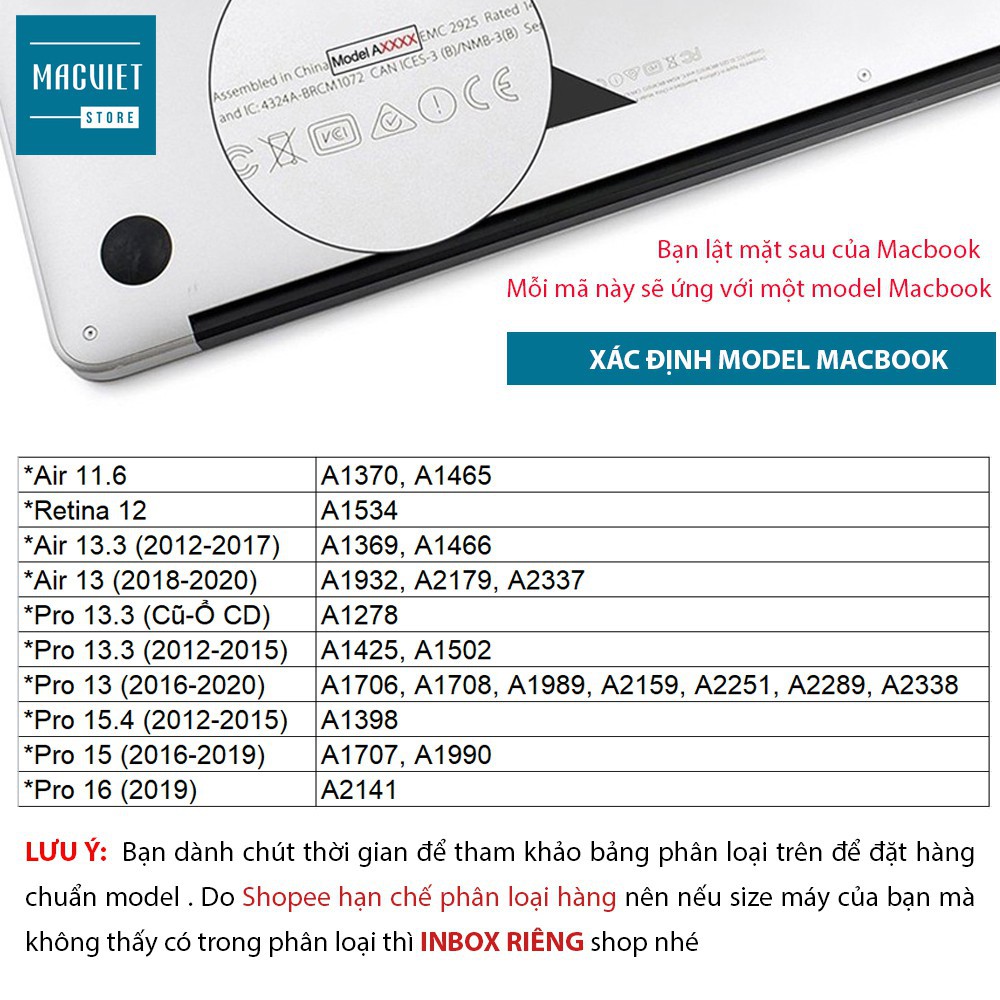 Bước 1: Bạn lật mặt sau của Macbook sẽ có ghi mã Model ( Trên ảnh sản phẩm shop có ảnh hướng dẫn).