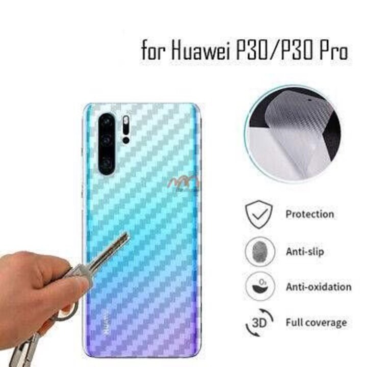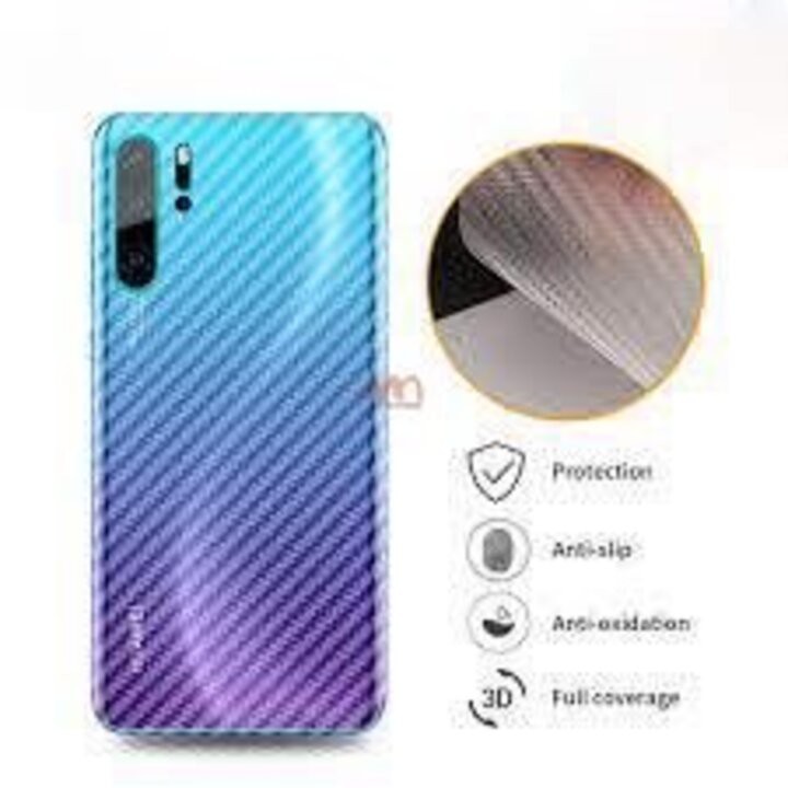 GIỚI THIỆU VỀ SẢN PHẨM DÁN NẮP LƯNG VÂN CARBON HUAWEI P30 / P30 PRODán nắp lưng vân carbon Huawei P30 / P30 Pro là miếng dán giúp bảo vệ mặt lưng của chiếc điện thoại Huawei P30 và P30 Pro. Miếng dán lưng có khả năng hạn chế những vết trầy xước trên mặt kính lưng điện thoại. Miếng dán với thiết kế họa tiết vân carbon cho cảm giác cầm nắm chắc chắn, chống bám vân tay. Miếng dán nắp lưng vân carbon đem đến cho bạn sự yên tâm trong quá trình sử dụng. Đây là phụ kiện điện thoại độc đáo vừa có tác dụng bảo vệ điện thoại hiệu quả mà không làm mất đi vẻ đẹp nguyên bản của máy.
