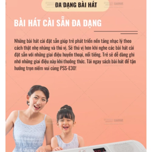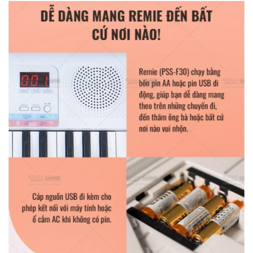 Bước khởi đầu của những điều đặc biệt. PSS-E30 (Remie) có âm thanh tuyệt vời, bàn phím được chế tạo riêng cho bàn tay nhỏ của trẻ, và sách bài hát được thiết kế giúp bạn có thể dễ dàng hướng dẫn cho bé. Các nhạc trưởng tí hon dễ dàng tự lấy ra và cất đi nhạc cụ gọn nhẹ này. Hãy mang lại tiếng cười cho trẻ khi khám phá thế giới âm nhạc!