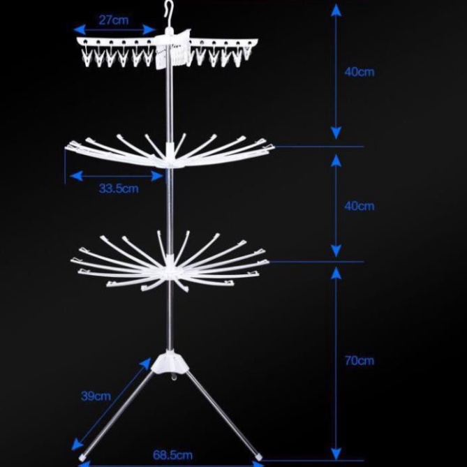 + Chân giá được đỡ bởi 3 ống inox song song đảm bảo độ chịu lực tốt, có thể tải được khối lượng đồ phơi lớn có thể xoay 360 độ, xếp gọn.
