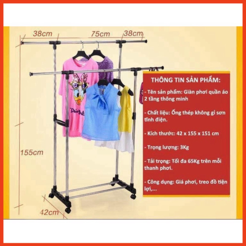 DÀN PHƠI QUẦN ÁO INOX 2 TẦNG CÓ BÁNH XE DI CHUYỂN THÔNG MINH | (LH3)