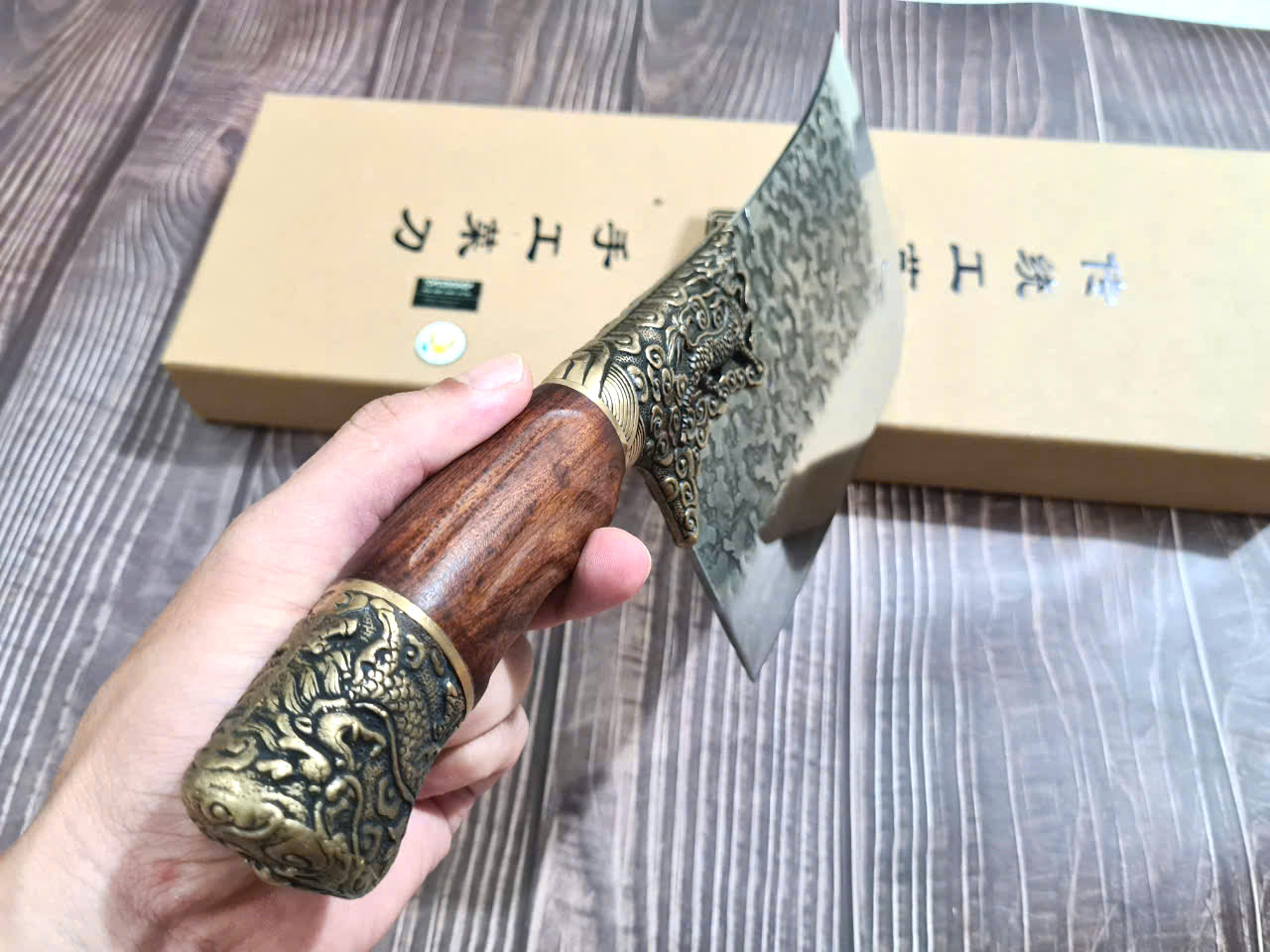 Chất liệu tay cầm: gỗ CẨM LAI, khâu và chuôi cuối dao bằng đồng thau