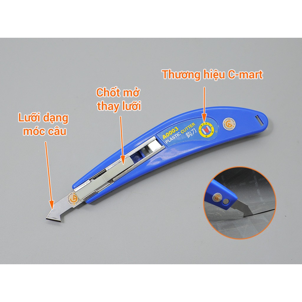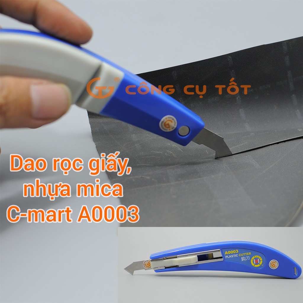 Dao cắt mica C-Mart A0003 khá đa năng dùng để cắt , rọc tấm mica, alu, tấm đồng, cắt mạch phíp điện tử rất tốt.Dao móc câu C-Mart A0003 khá đa năng dùng để cắt , rọc tấm mica, alu, tấm đồng, cắt mạch phíp điện tử rất tốt. Ngạch móc câu có thể dùng như một dụng cụ gọt ba via sau khi cắt.