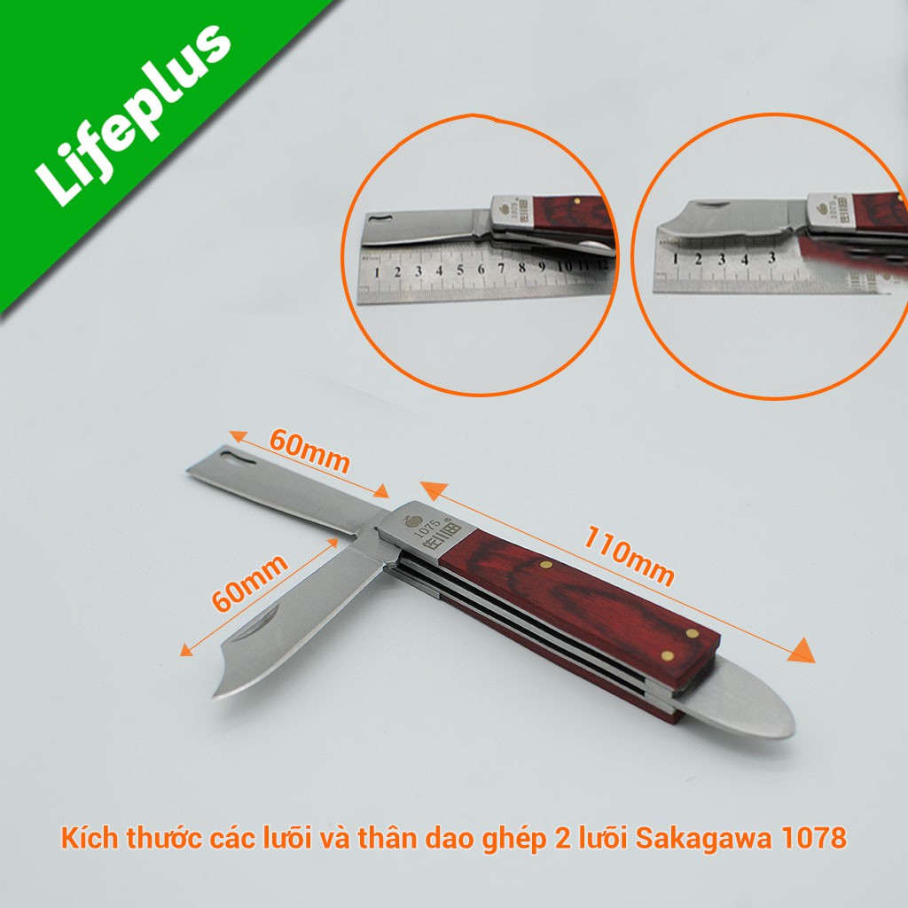 Dao ghép 2 lưỡi Sagawa 1078 chuyên sử dụng để ghép cây, ghép cành. Với lưỡi thép cacbon SK5 từ Nhật sắc bén, lưỡi dao có thể gấp gọn. Dao ghép 2 lưỡi Sagawa 1078 đã trở thành sản phẩm tin dùng của nhiều người thợ trong suốt thời gian qua.Dao ghép cây là một sản phẩm phổ thông nhất trong các dụng cụ ghép cây. Mặc dù trên thị trường có rất nhiều dụng cụ chuyên dung để ghép cây như kéo cắt ghép cây dạng U V Ω nhưng với dụng cụ này chỉ áp dụng với một số dạng ghép cây nhất định mà không phải loại cây nào cũng có thể sử dụng ghép dạng đó. Với dao ghép cây 2 lưỡi Sagawa 1078 chuyên dụng thì khác, dao ghép cây được sử dụng rộng rãi và đa năng nhất, có thể nói với phương pháp ghép nào cũng có thể sử dụng được như ghép đoạn, ghép mắt, ghép nêm,... Vì vậy, dụng cụ dao ghép cây chuyên dụng là không thể thiếu với bất kì nhà làm vườn chuyên nghiệp nào.