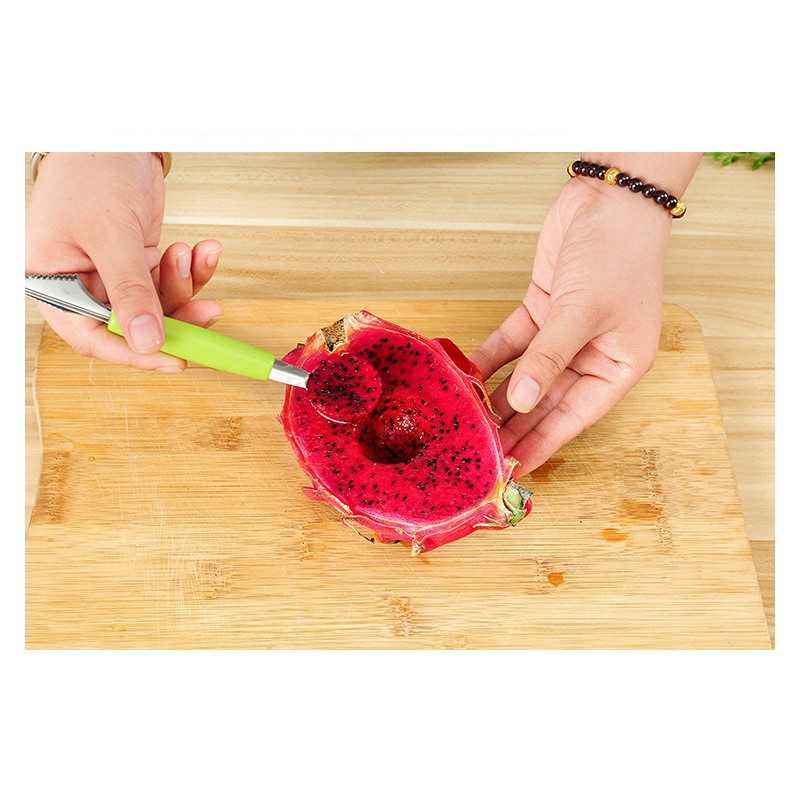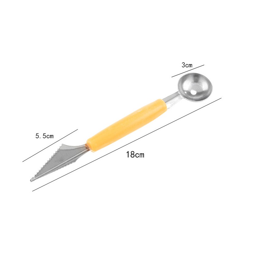 Dụng cụ cắt tỉa hoa quả 2 đầu:- Cấu tạo: gồm 2 đầu: 1 đầu là dao nhọn, lưỡi răng cưa, bằng inox, dùng tỉa các loại hoa quả như dưa hấu, dưa vàng, cam...; 1 đầu là muôi múc inox dùng múc hoa quả