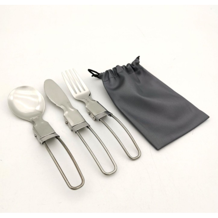 Bộ dao muỗng nĩa inox 304 xịn (nam châm không hít), muỗng nĩa dao gấp gọn có túi vải đi kèm