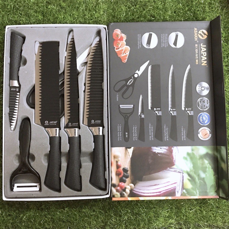 Bộ dao 6 món cao cấp công nghệ nhật Asakh được thiết kế hiện đại theo kiểu sóng nên rất dễ dàng trong việc thái gọt.