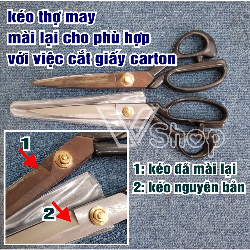 Về cơ bản thì hầu hết các loại kéo đều có thể dùng để cắt giấy được, nhưng để làm hộp cho đẹp, yêu cầu nét cắt phải thẳng và chính xác. Kéo yếu quá hoặc thô quá thì nét cắt thường bị cong, lệch. Khiến thao tác bị chậm và thành phẩm không được như ý. Qua nhiều thử nghiệm, mình chọn kéo thợ may để cắt. ưu điểm của kéo thợ may là: lưỡi kéo dài, sắc bén, lực cắt khoẻ, giúp thao tác nhanh và chính xác. Tuy nhiên, kéo thợ may có một khớp ( gờ ) nổi bên hông kéo. Gờ này gây cản trở khá nhiều mỗi khi cạnh giấy vướng vào. ( thợ may, cắt chất liệu vải, mềm, nên gờ này không gây trở ngại ) giải pháp là mài, bỏ gờ này đi là dùng được. mới nhìn, thấy dấu mài trên thân kéo, cảm giác hơi khó chịu, dùng vài ngày, quen mắt, thấy bình thường.