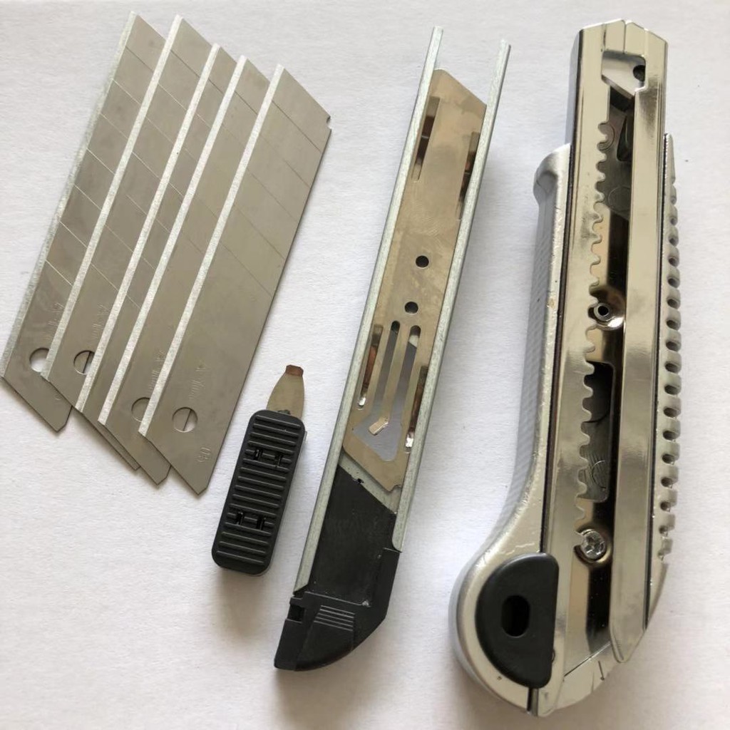 Dao rọc giấy cán nhôm tay cầm chắc chắn , phần thân bên trong chứa hẳn 5 lưỡi tiện lợi , tháo lắp thuận tiện và dễ dàng , vừa rẻ đẹp vừa tiện lợi , thân nhôm màu bạc rất sang xịn