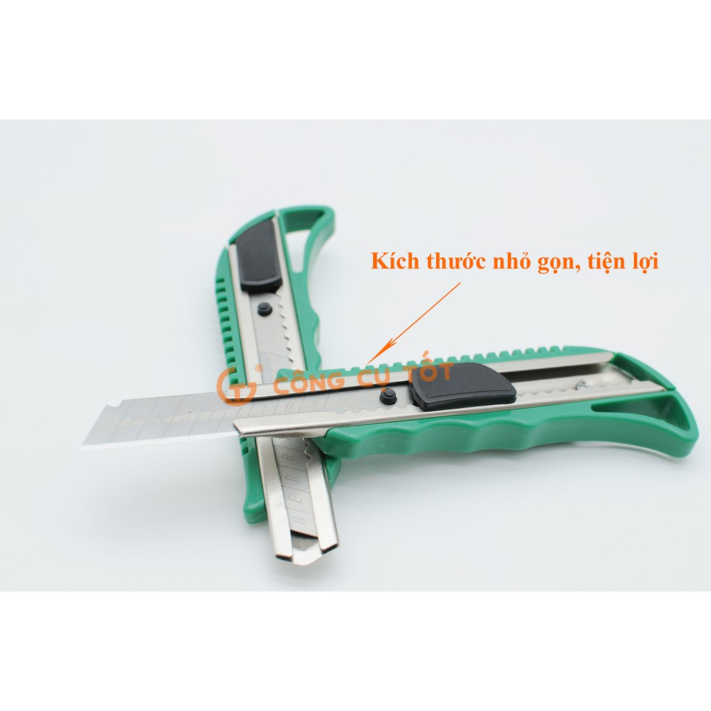 Tay cầm bọc nhựa được thiết kế có những đường vân chạy dài tạo cảm giác chắc chắn, chống trơn trượt khi sử dụng. Phần tay trượt có thể điều chỉnh độ dài lưỡi dao theo từng nấc theo ý muốn.