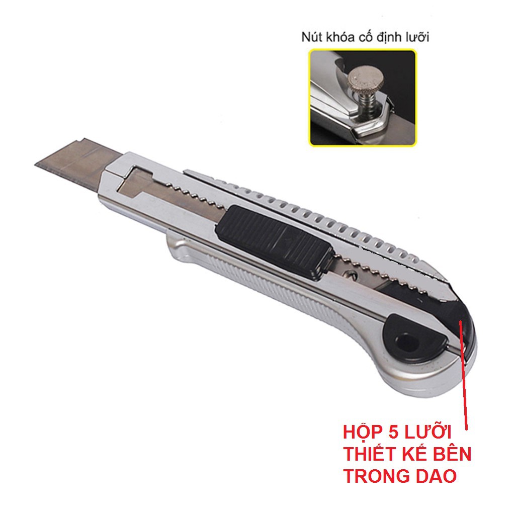 Dao rọc giấy 5 lưỡi cáo cấp: có thiết kế 5 lưới dao trong thân dao rất tiện lợi khi muốn mang theo để dự phòng cần thay lưỡi, tay cầm chắc chắn, có chốt định vị giữ lưỡi dao luôn chắc chắn không bị di chuyển