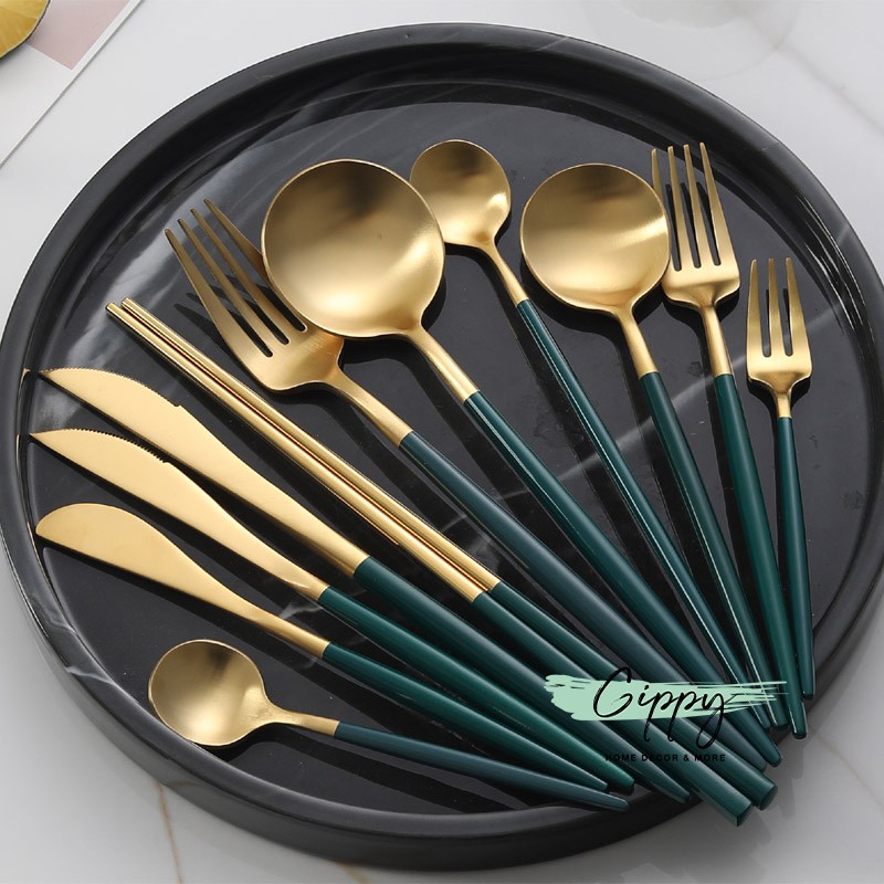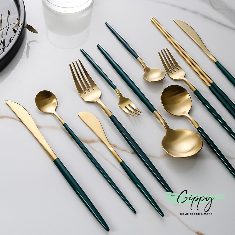 Nhà cửa & Đời sống > Bộ đồ bàn ăn > Bộ dao kéo || Dao thìa dĩa đũa màu gold chuôi xanh cổ vịt phong cách Bắc Âu (bán lẻ) - Gippy DecorCòn hàng