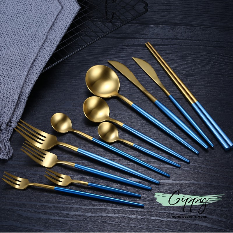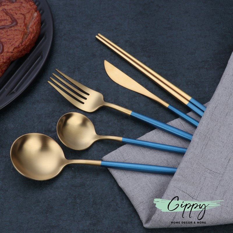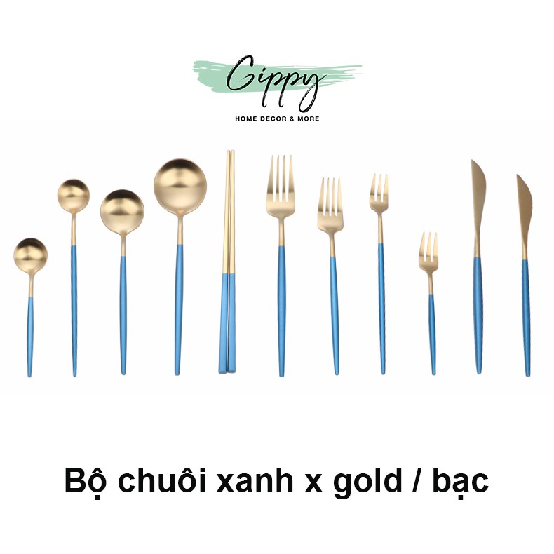Dao thìa dĩa màu gold, màu bạc chuôi xanh phong cách Bắc Âu - Gippy Decor