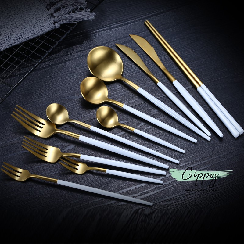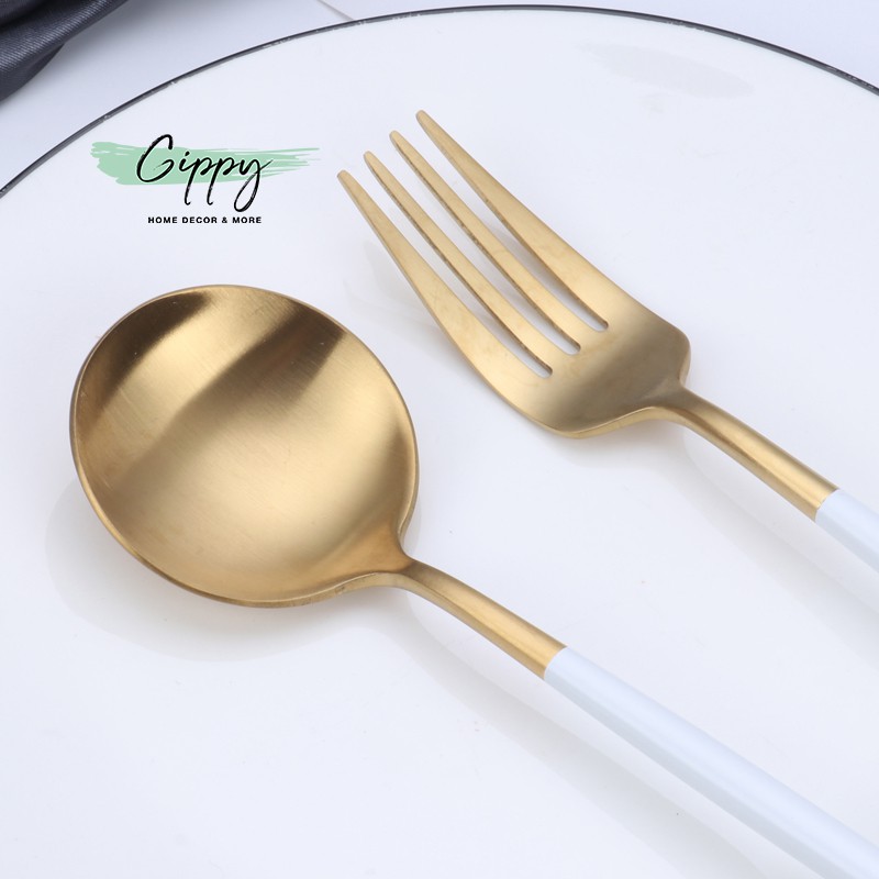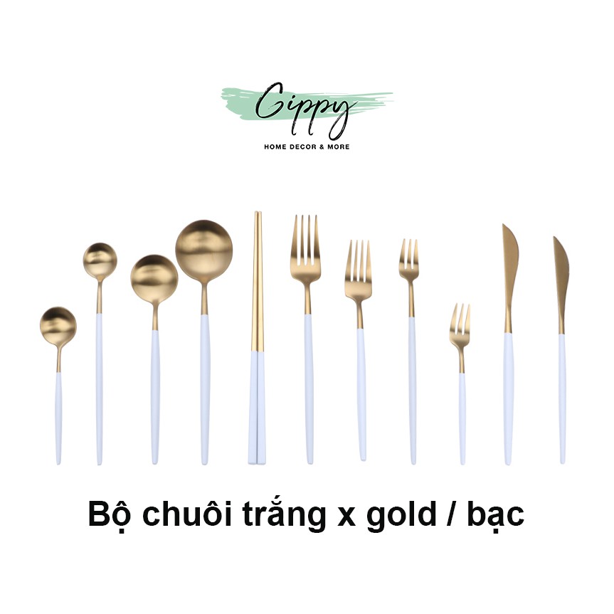 Dao thìa dĩa màu gold, màu bạc chuôi trắng phong cách Bắc Âu - Gippy Decor