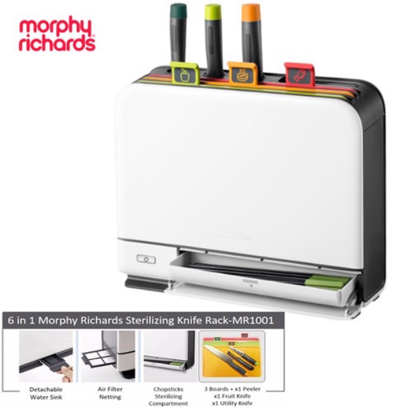 Bộ dao và thớt khử kháng khuẩn UV, sấy khô 70ºC. Thương hiệu Morphy Richards - MR1001Tiếp nối thành công phiên bản MR1000. Trong năm 2021 Hãng sản xuất Anh Quốc đã cho ra đời dòng sản phẩm Morphy Richards MR1001 Bộ Dao Thớt Khử Khuẩn UV + Sấy Khô 70ºC bổ sung nhiều tính năng nâng cấp hoàn toàn mới .