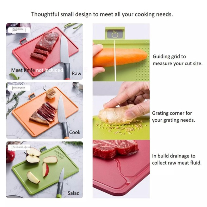 * Bộ sản phẩm bao gồm: 03 thớt và 03 dao thiết kế riêng biệt, phân loại bằng màu sắc thuận tiện sử dụng. Bảo vệ chế độ ăn, uống lành mạnh cho gia đình bạn.