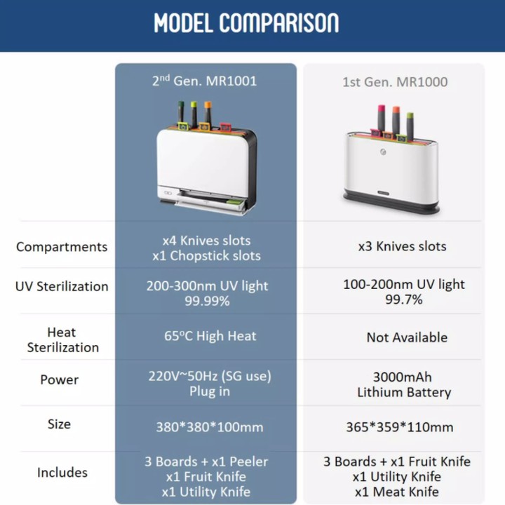 Bộ Dao Thớt Khử Khuẩn UV Và Sấy Khô Morphy Richards MR1001Tiếp nối thành công phiên bản MR1000. Trong năm 2021 Hãng sản xuất Anh Quốc đã cho ra đời dòng sản phẩm Morphy Richards MR1001 Bộ Dao Thớt Khử Khuẩn UV + Sấy Khô 70ºC bổ sung nhiều tính năng nâng cấp hoàn toàn mới .