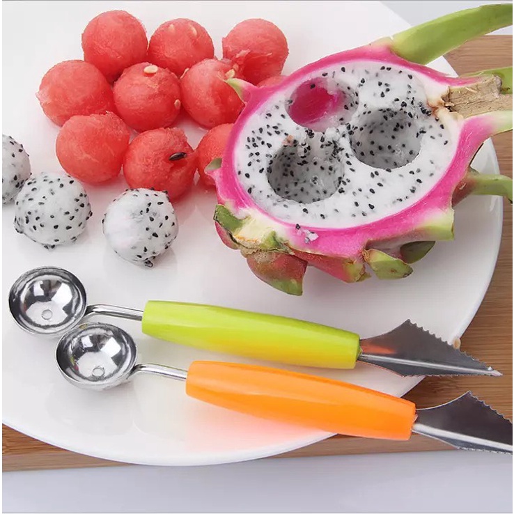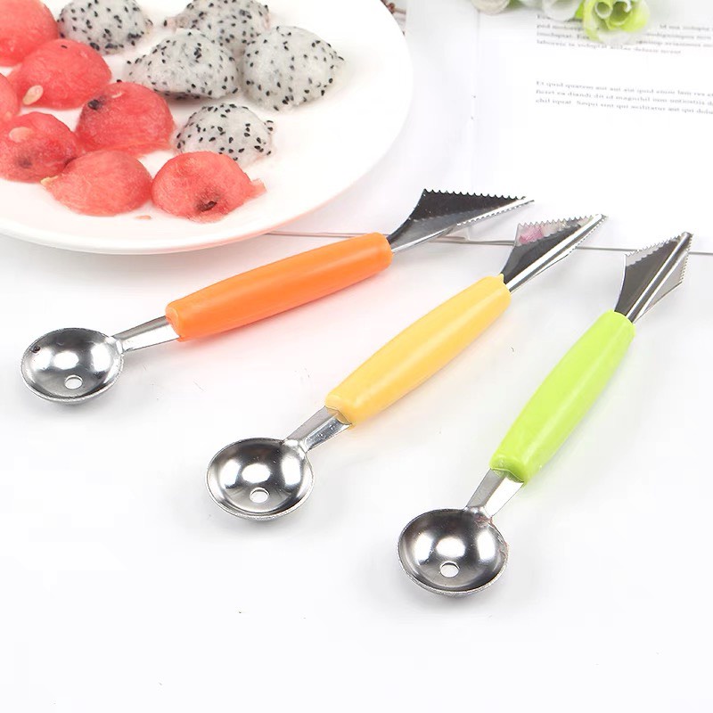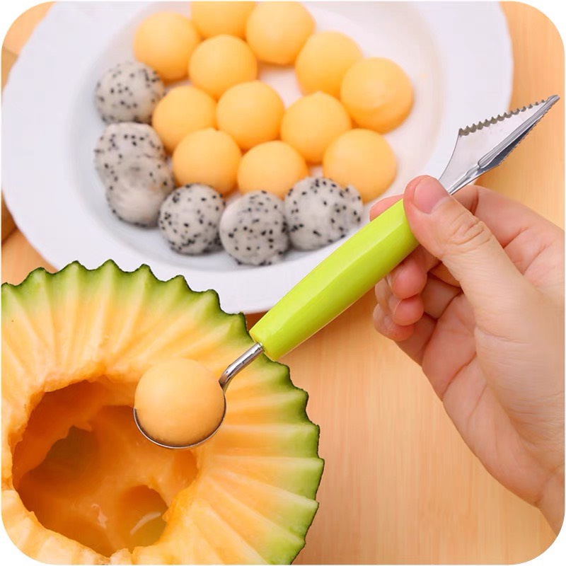 Muỗng hai đầu được thiết kế gồm 2 đầu, một đầu dùng để múc các loại quả mềm như dưa hấu, đu đủ, thanh long… một đầu để tỉa rau củ, hoa quả, cho bạn gái thể hiện sự khéo léo và cắt tỉa nhiều dĩa hoa quả bắt mắt cho cả gia đình.