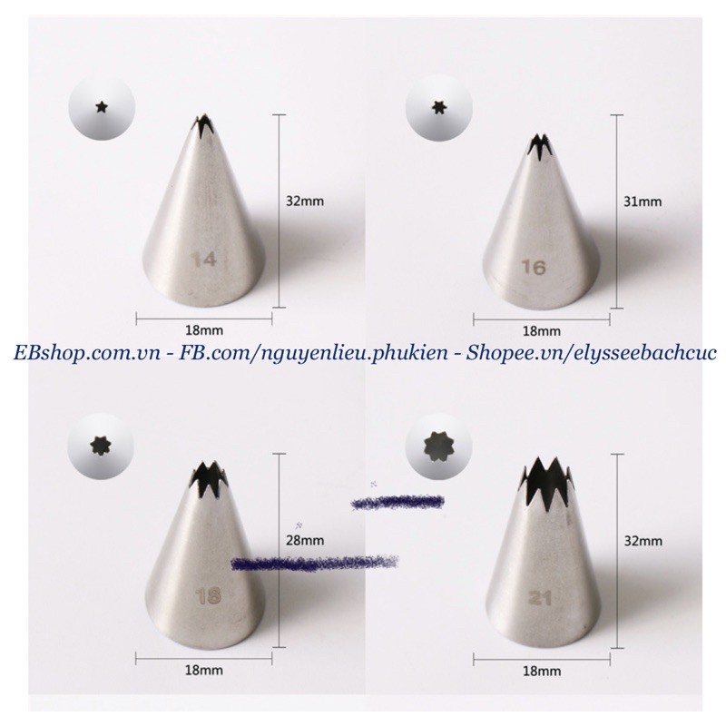 Các mẫu đui sò/đui sao cỡ nhỏ dùng để bắt kem trang trí bánh.Chất liệu inox 304 dày dặn, chống rỉ sét.