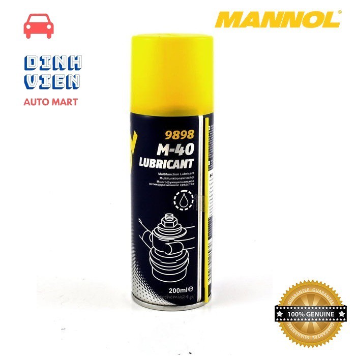 Dầu Bôi Trơn, Chống Gỉ, Bảo Vệ Kim Loại, Đa Năng MANNOL 9898 M-40 Lubricant (smart) 200ML Multifunction LubricantMANNOL M-40 Lubricant là chất bôi trơn dạng xịt đa năng (thẩm thấu, làm sạch, chống ăn mòn, độ ẩm - dịch chuyển, chống rít, v.v.) - một chất tương tự của WD-40. Nó có đặc tính bôi trơn và bảo vệ độc đáo và có nhiều ứng dụng. Lý tưởng để sử dụng chuyên nghiệp và gia đình. Nó là một hỗn hợp dầu và dung môi hoạt tính thẩm thấu nhanh có hiệu quả cao.