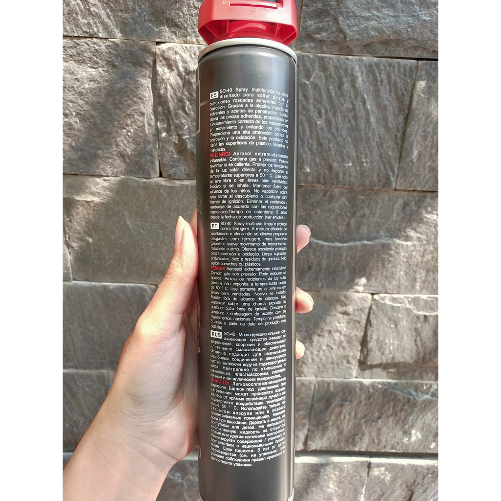 - SO-40 là dâì bôi trơn đa năng, làm sạch và bảo vệ mọi bề mặt cũng như trên các bộ phận chuyển động. Đánh bay nước, rỉ sét và cặn bẩn, ngăn ngừa đoản mạch và rò rỉ điện, chống ăn mòn và đảm bảo các bộ phận chuyển động hoạt động trơn tru. Đi kèm đầu xịt thông minh tiện dụng. An toàn tuyệt đối với các bề mặt cao su, nhựa, véc ni và kim loại.