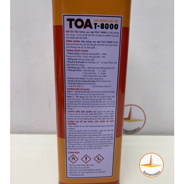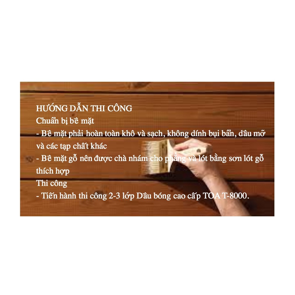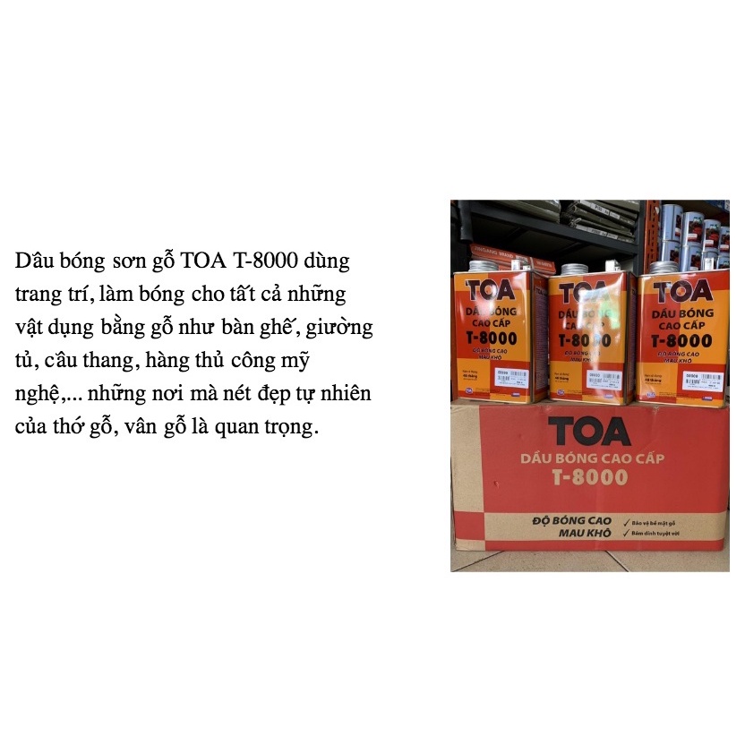 Dầu bóng cao cấp TOA T-8000 là sơn dầu bóng cho gỗ, tôn nét đẹp tự nhiên của các thớ gỗ, vân gỗ,...MỤC ĐÍCH SỬ DỤNG: