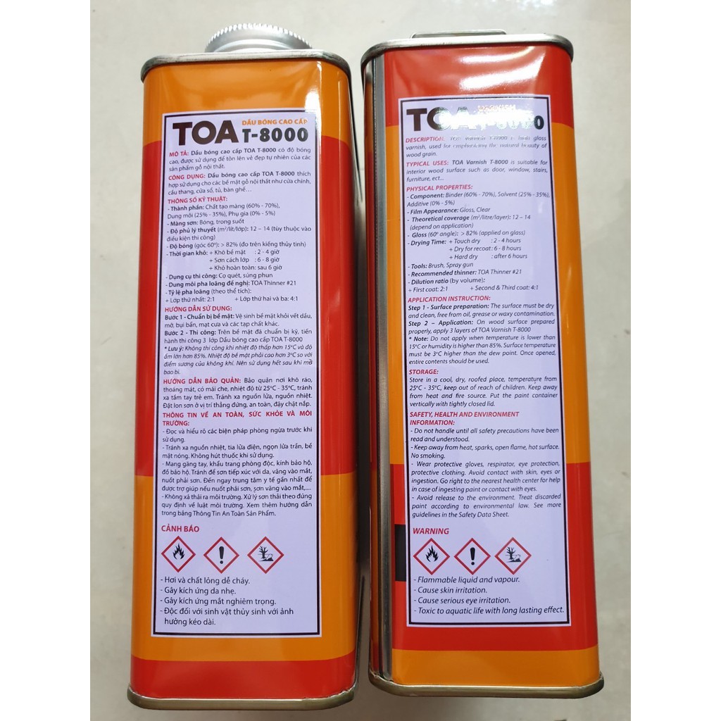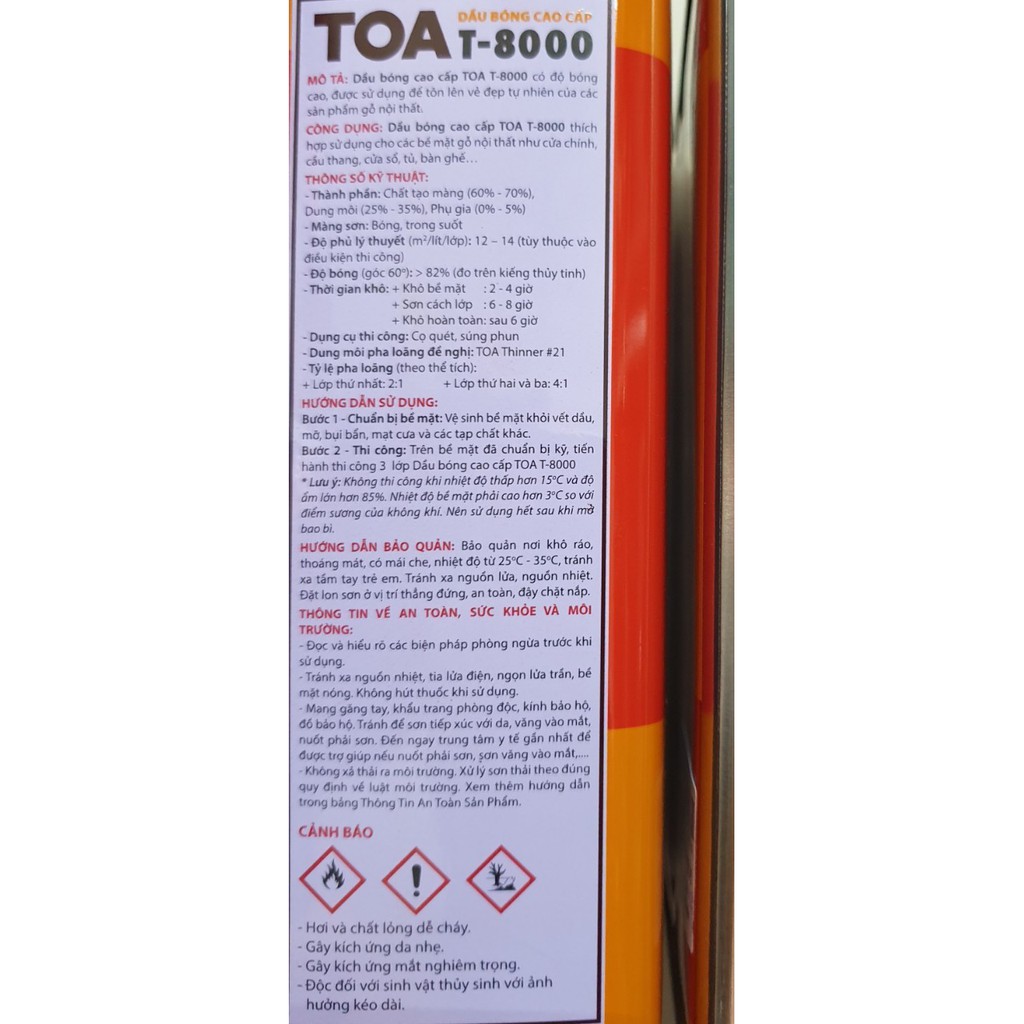 Đặc điểm : Dầu Bóng TOA (T-8000) đem lại độ bóng cao, bám dính tốt, dễ sử dụng và chậm vàng