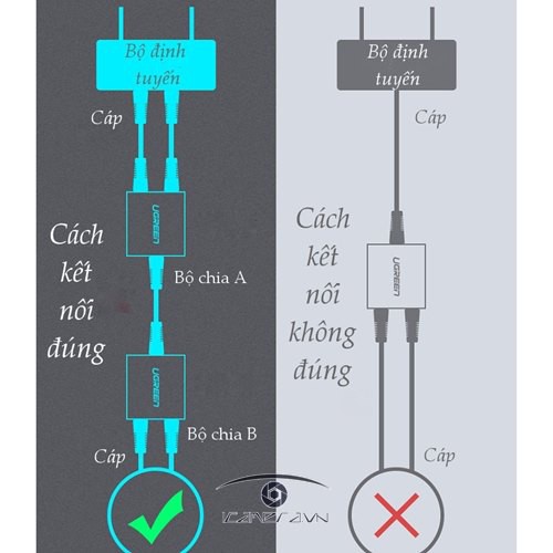 * Lưu Ý: Cần phải cắm cả 2 cổng: IPTV và LAN trên modem vào bộ chia A thì mới có thể sử dụng được cả 2 chức năng IPTV và internet ở đầu ra của bộ chia B