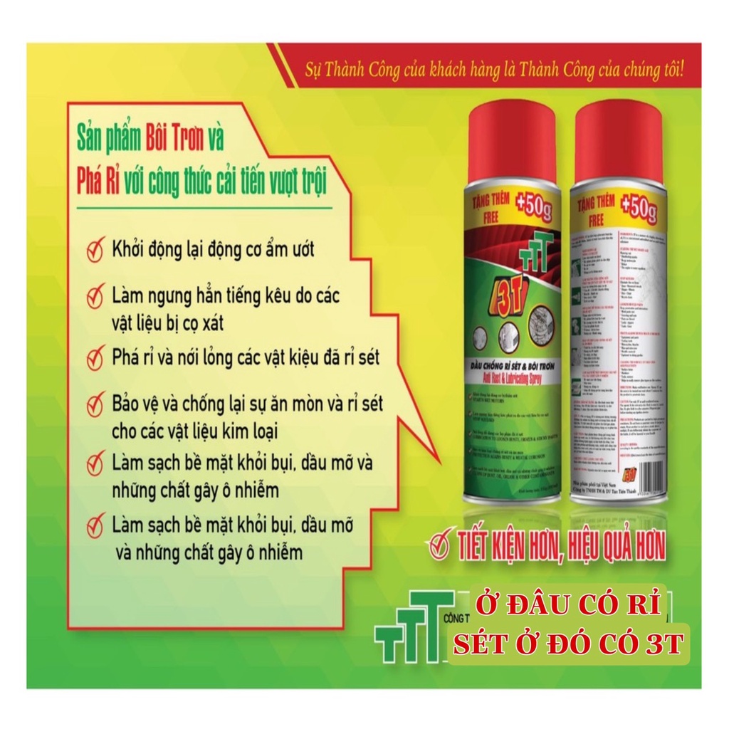 Dầu chống phá rỉ sét và bôi trơn 3T chuyên dụng cho ô tô xe máy.✅ Dầu chống rỉ sét và bôi trơn 3T là một sản phẩm hỗn hợp gồm một loại dầu cao cấp dễ thấm nhờn, được chế tạo bằng công thức cải tiến và một hóa chất đậm đặc có tính năng chống rỉ sét và bôi trơn đa năng.