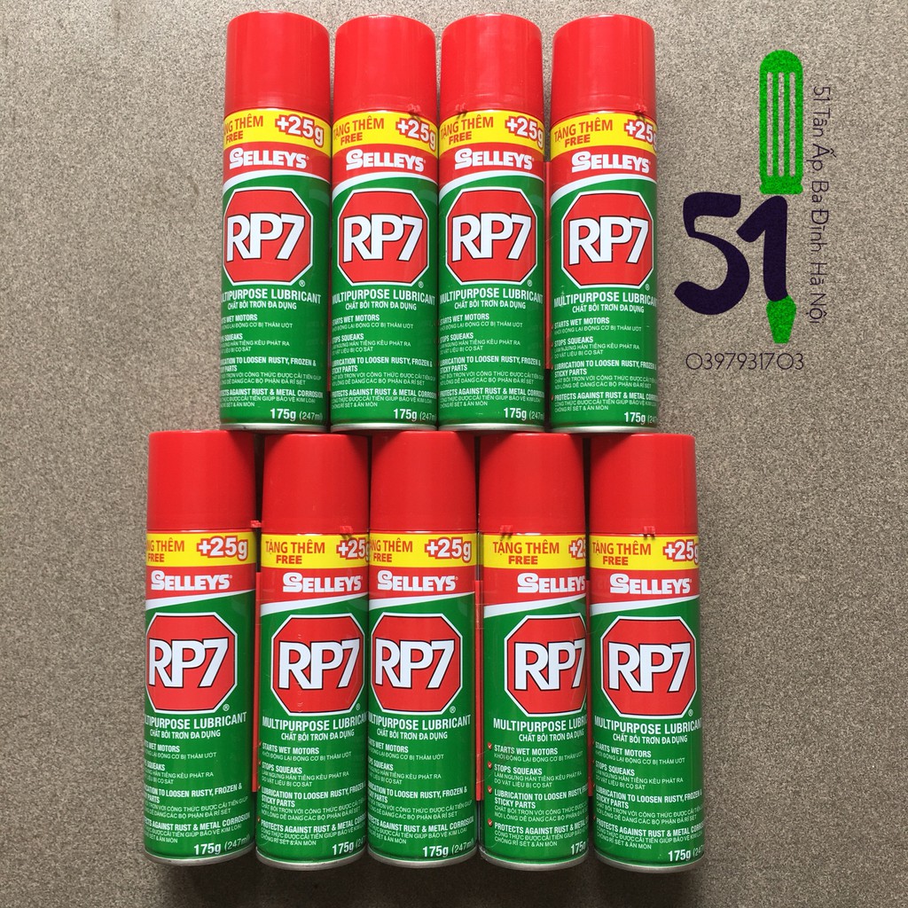 - Dầu chống rỉ sét RP7 được cung cấp dưới dạng chai xịt đa dụng, có tác dụng chống rỉ (gỉ) sét, bôi trơn, bảo vệ kim loại chống ăn mòn,… Đây là một sản phẩm được tin dùng của Selleys (Úc), là một hỗn hợp gồm một loại dầu cao cấp dễ thấm nhờn, được chế tạo bằng công thức cải tiến và một hóa chất đậm đặc chống rỉ (gỉ) sét.