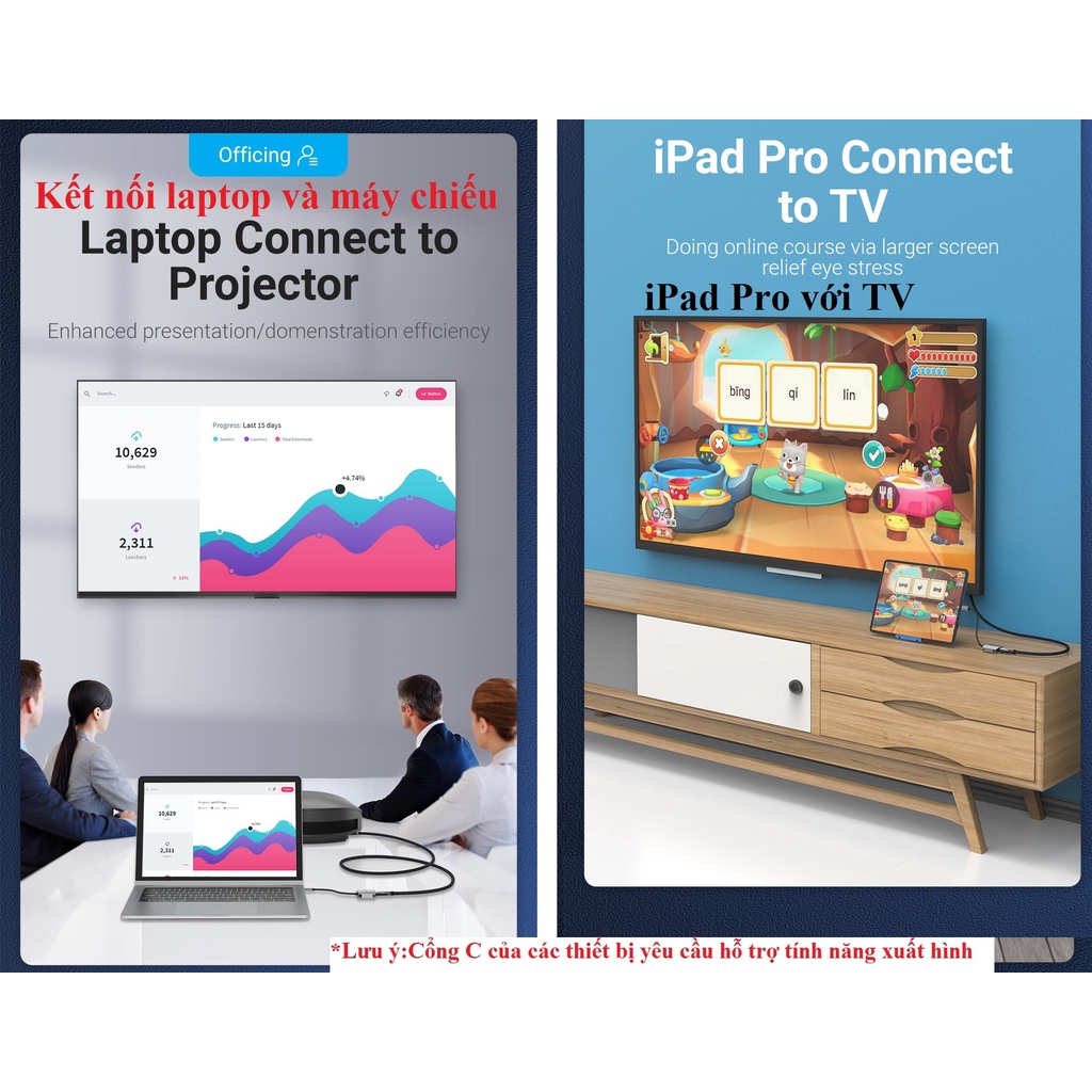 -Giúp kết nối điện thoại, ipad, laptop cổng type-C với màn hình...