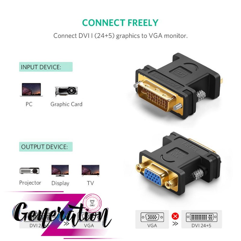 Đầu Chuyển DVI 24+5 Sang VGA Ugreen 20122Ugreen 20122 là phụ kiện giúp bạn kết nối máy tính, card màn hình và các thiết bị khác có cổng DVI 24+5 (DVI-I) với màn hình và các thiết bị trình chiếu khác cổng VGA. Adaptor chuyển DVI-I sang VGA Ugreen 20122 hỗ trợ độ phân giải hình ảnh lên đến 1080P@60Hz, do đó, bạn hoàn toàn có thể trải nghiệm trình chiếu hình ảnh độ nét cao như xem phim, làm việc và học tập....