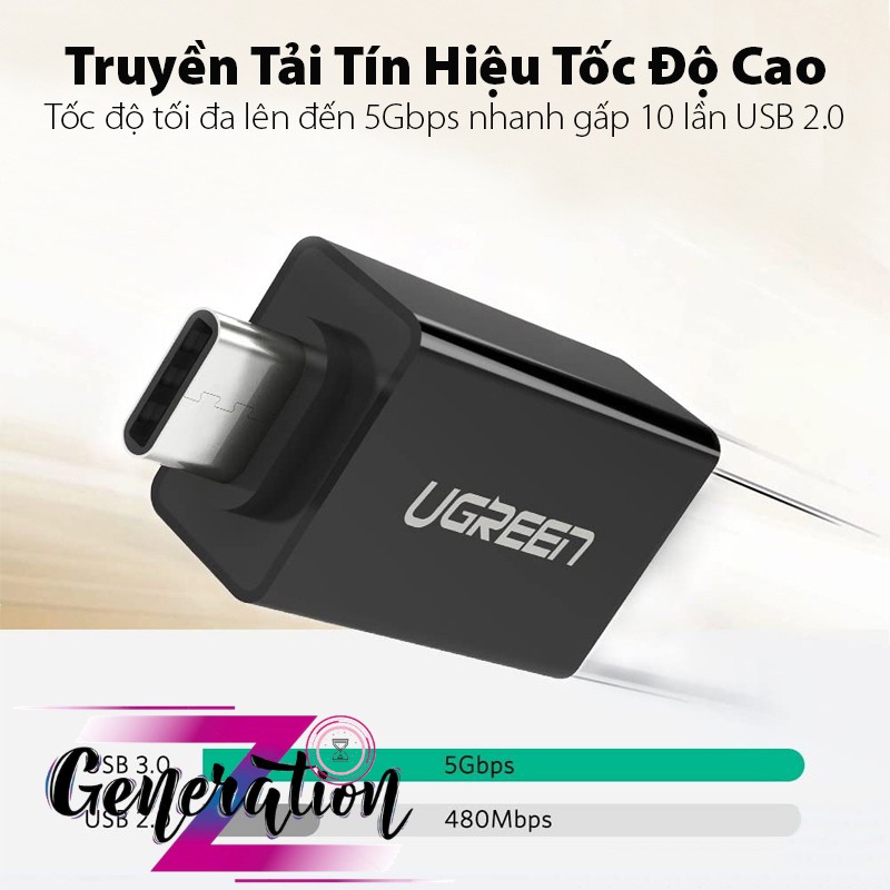 USB Type-C sang USB 3.0 Ugreen 20808 có tốc độ truyền tải tối đa là 5Gbps, tương thích ngược với USB 2.0, 1.1