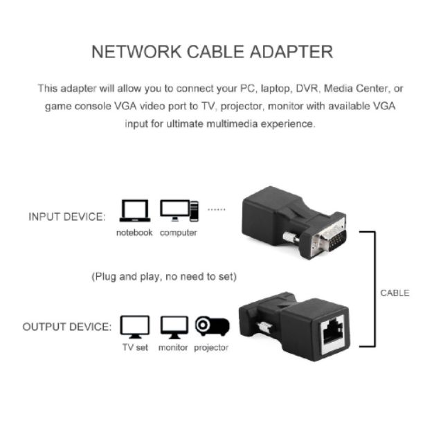- Đầu chuyển đổi VGA sang cáp mạng RJ45. Tận dụng cáp mạng có sẵn làm cáp tín hiệu VGA, giúp bạn tiết kiệm chi phí, dễ dàng thi công lắp đặt.- Sử dụng cáp mạng cAT5E, 6, 6E chiều dài lên tới 30M (hình ảnh đẹp)