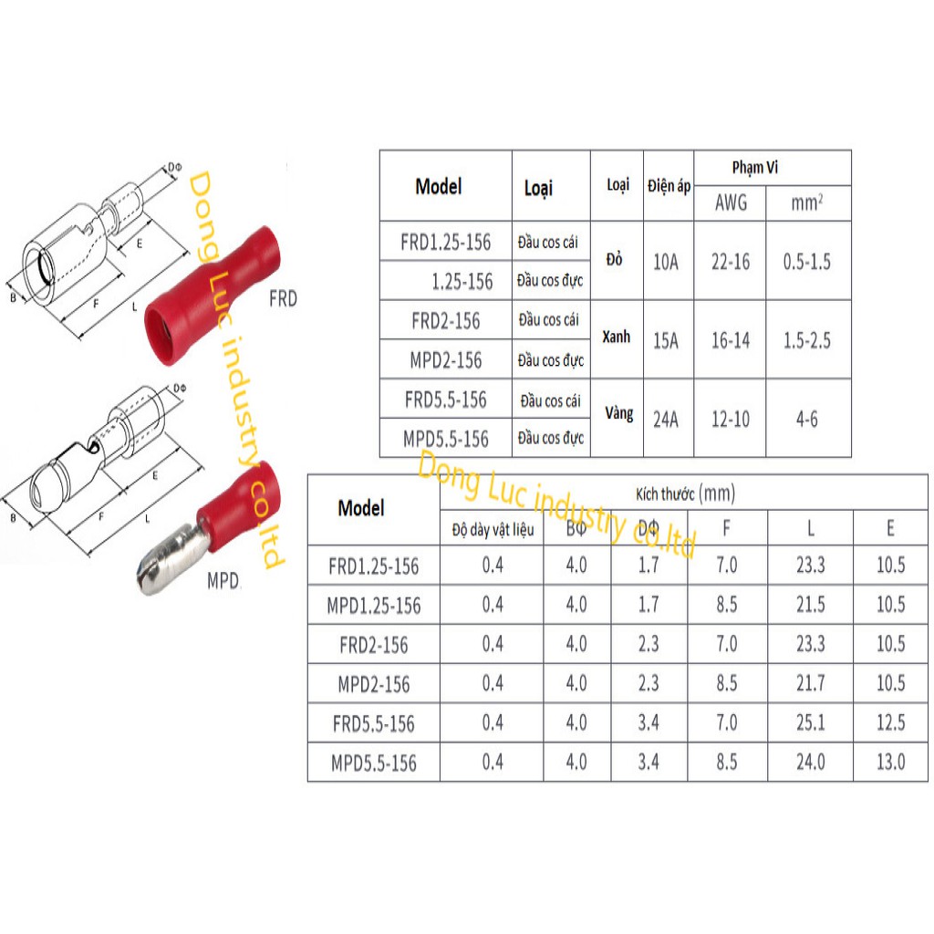 Giới thiệu Đầu Cos đực cái MPD FRD 1.25-156 100 hoặc 50cặp, cốt âm dương ghim tròn, cosse bấm nối dây điện 0.5mm 1.5mm bằng đồng