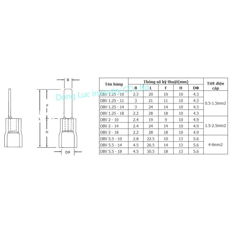 . Đầu cos pin dẹp đặc DBV 2-10 sử dụng cho cáp 2mm²,