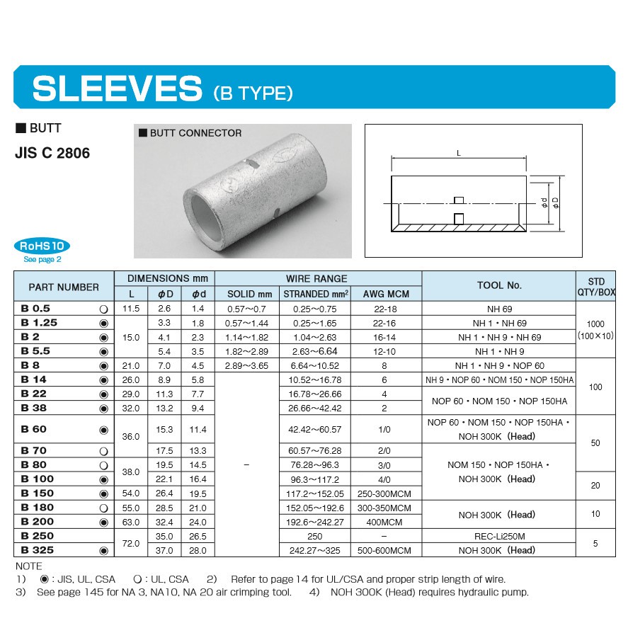 Đầu Cốt nối B/Đầu Cos nối B: B1.25, B2, B5.5, B8, B14,B22,B38,B60,B80 NichifuSản phẩm của Nichifu được tổ chức sản xuất theo tiêu chuẩn quản lý chất lượng ISO9001. Đầu Cosse nối B được kiểm định kỹ thuật chặt chẽ; đáp ứng các tiêu chuẩn kỹ thuật: