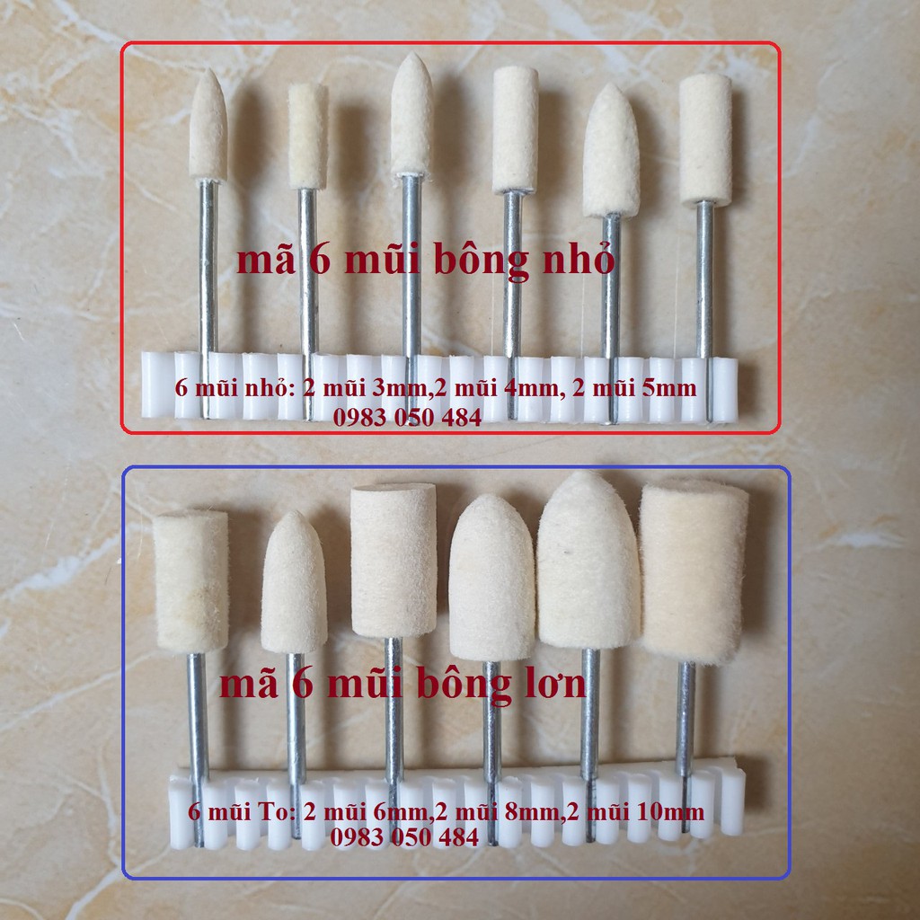 có 2 mã kích cỡ đầu đánh bóng khác nhau các bạn lựa chọn nhémã 1: 6 mũi nhỏ: 2 mũi 3,2 mũi 4, 2 mũi 5