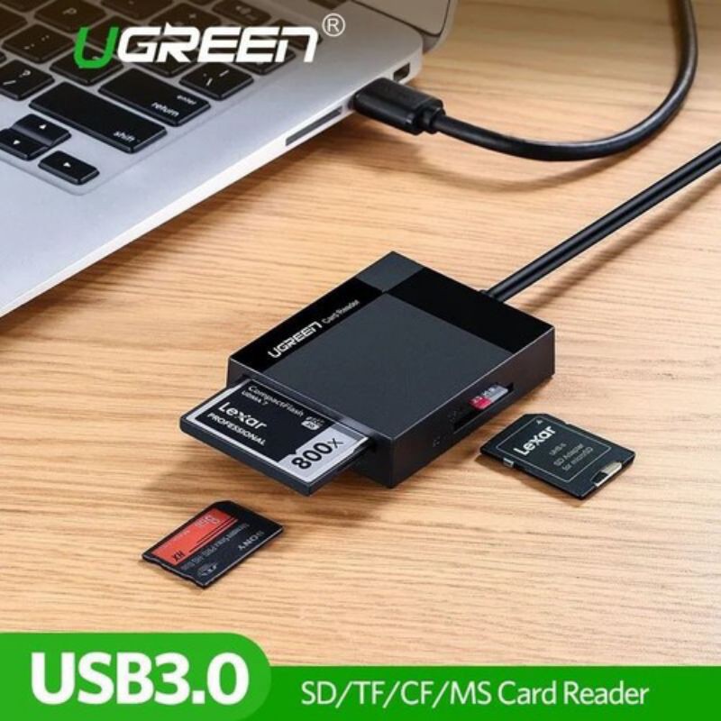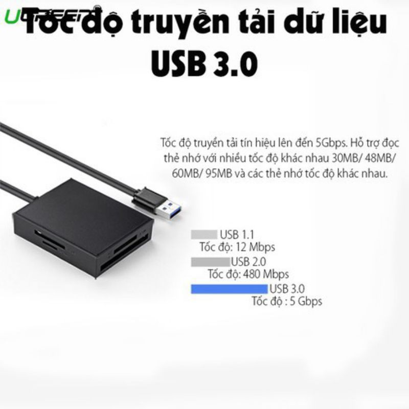 Đầu đọc thẻ nhớ SD/TF/CF/MS chuẩn USB 3.0 Ugreen 30229 cao cấp sử dụng đọc các thẻ SD/TF/CF/MS với máy tính, Macbook hỗ trợ cổng USB 3.0 với tốc độ truyền tải file dữ liệu lên tới 5Gbps cho phép truyền tải tập phim HD trong vòng vài giây.