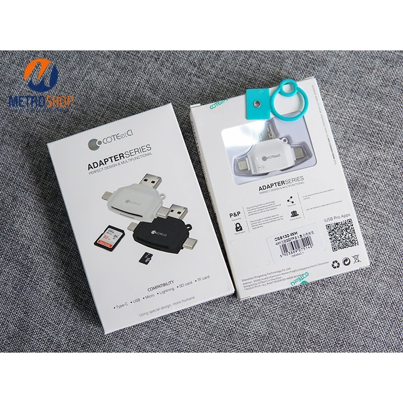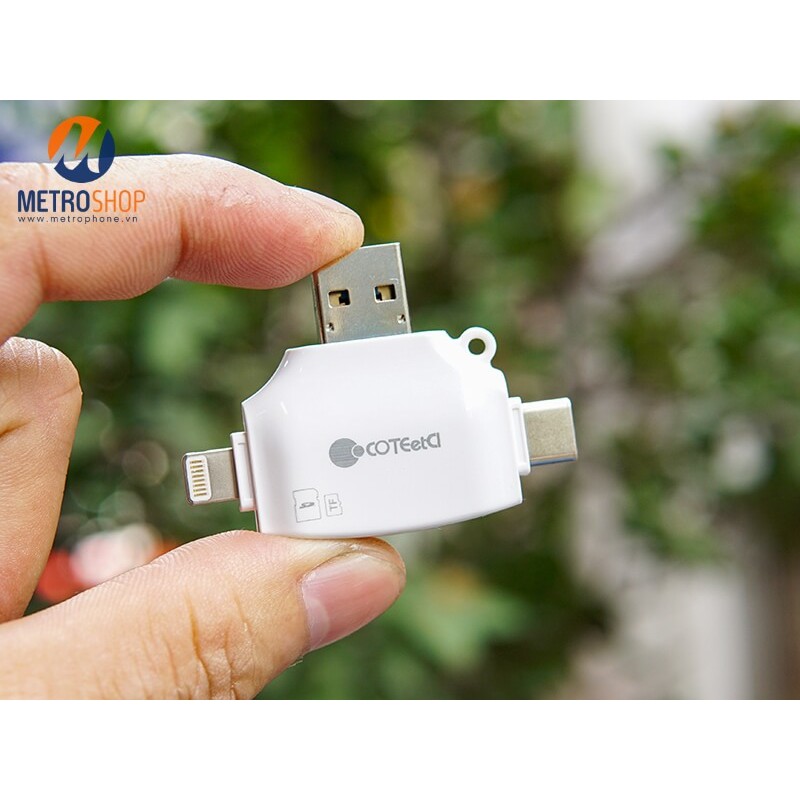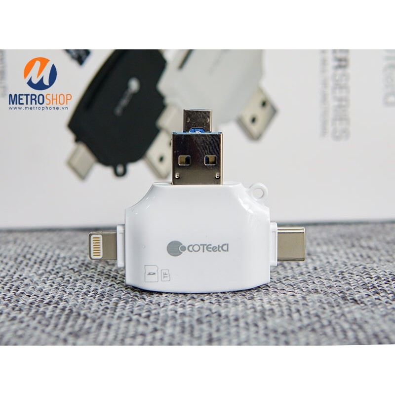Đầu đọc thẻ đa năng tất cả trong một Coteetci chứa đựng tất cả các cổng kết nối của điện thoại và latop hiện tại. Bao gồm cổng Lightning, Type-C, Micro USB, USB 3.0. Hỗ trợ được thẻ SD và Micro SD. Phù hợp với nhu cầu của đại đa số người dùng từ nhân viên văn phòng đến các nhiếp ảnh gia.