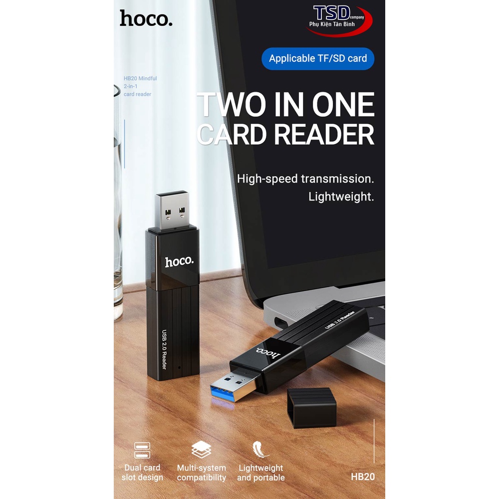 - Đầu đọc thẻ nhớ đa năng Hoco HB20 được gia công bằng chất liệu nhựa PVC siêu bền có tính chịu lực cao. Bên cạnh đó là thiết kế vô cùng nhỏ gọn với tông màu đen, là giải pháp tối ưu cho việc truyền tải dữ liệu từ thẻ nhớ vào máy tính của bạn.