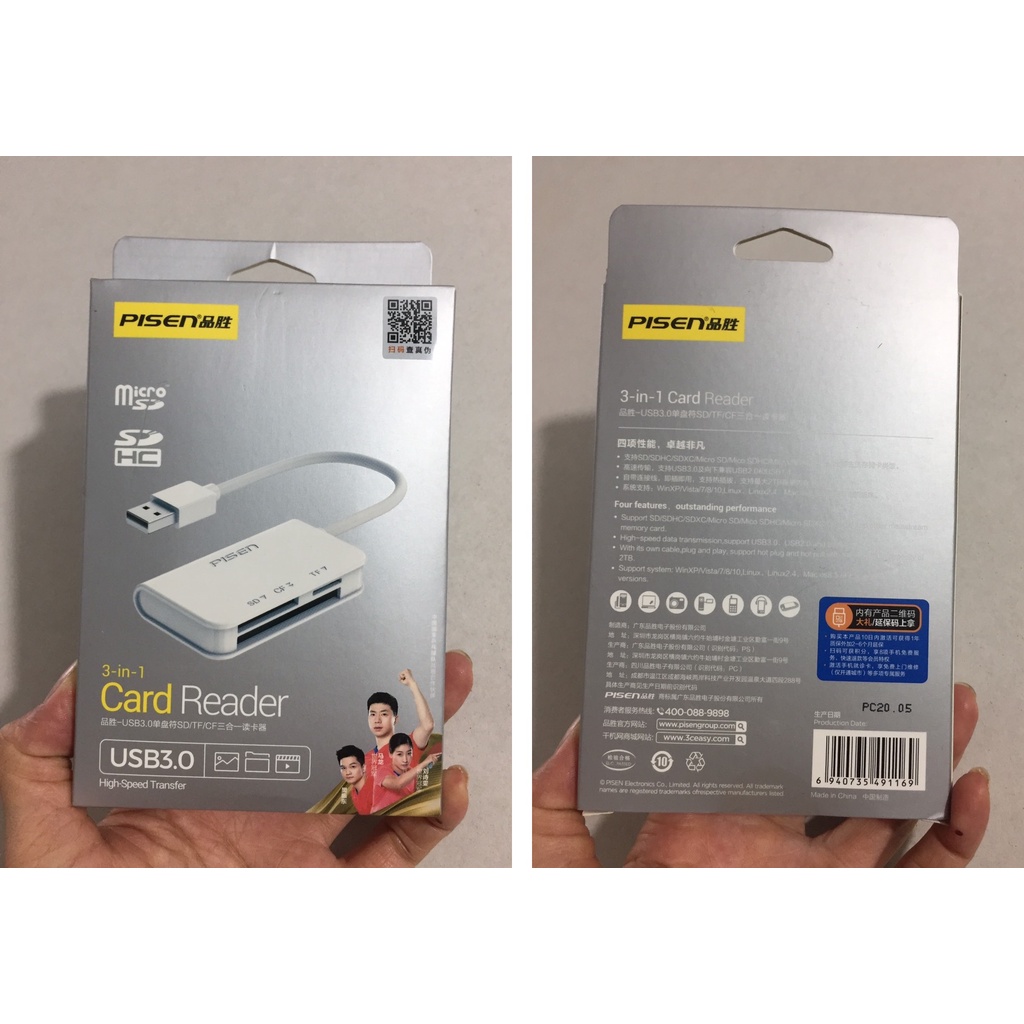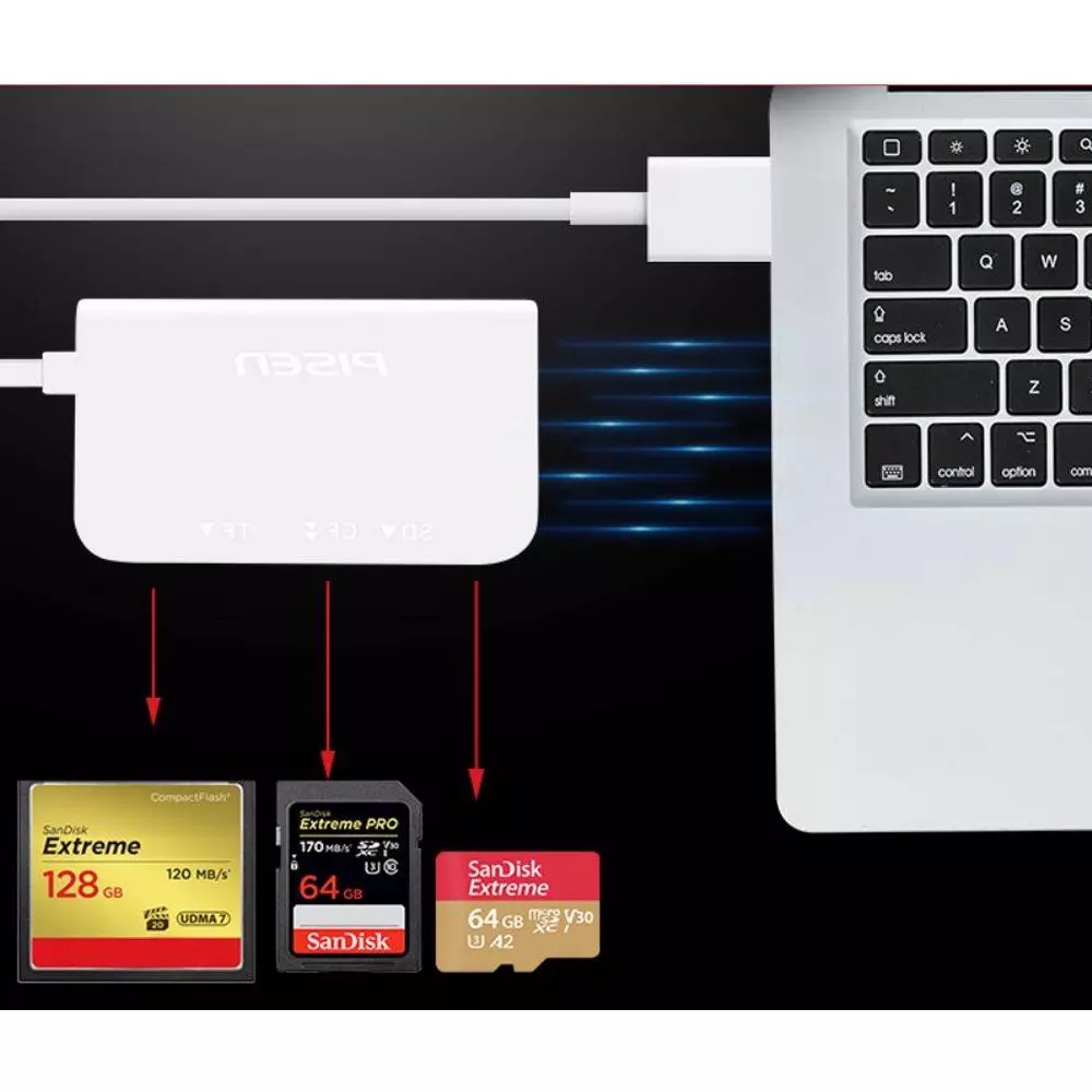 Đầu đọc thẻ nhớ 3 trong 1 thương hiệu Pisen, Model: TS-E131-Giao tiếp USB 3.0, tương thích USB 2.0. USB 1.1