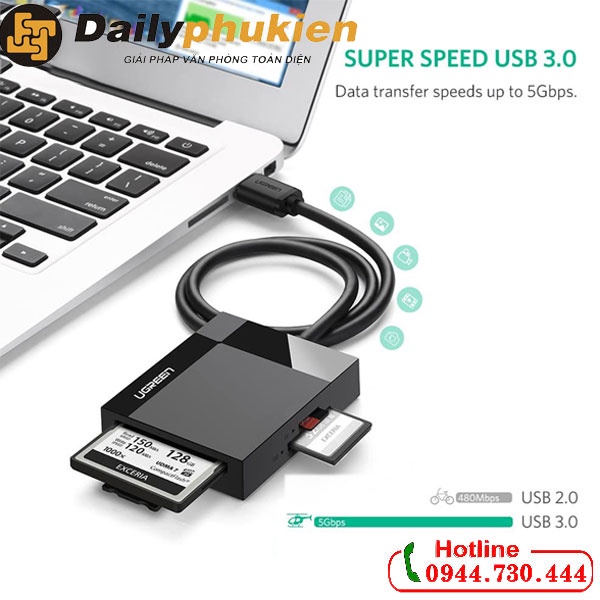 Đầu đọc thẻ nhớ đa năng SD/TF/CF/MS Ugreen 30231 sử dụng đọc các thẻ SD/TF/CF/MS với máy tính, Macbook hỗ trợ cổng USB 3.0 với tốc độ truyền tải file dữ liệu lên tới 5Gbps cho phép truyền tải tập phim HD trong vòng vài giây