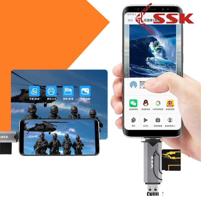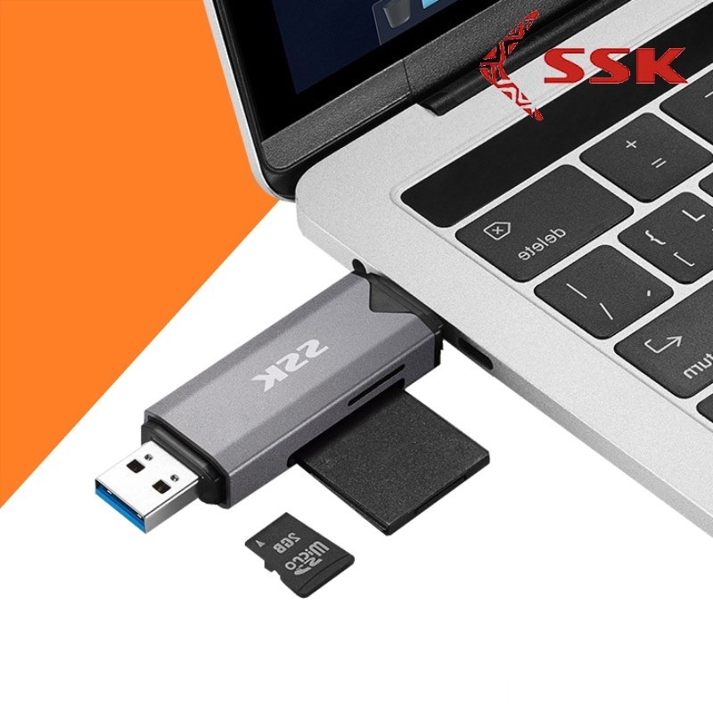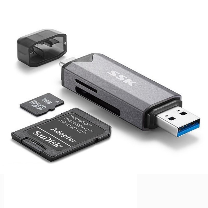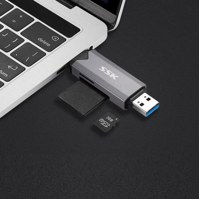 - Đầu đọc thẻ nhớ đa năng Đầu đọc thẻ nhớ đa năng SSK SCRM390 chuyên dùng để đọc các loại thẻ nhớ cơ bản hiện nay. Với 2 đầu kết nối phổ thông là Type C và USB 3.0 tốc độ cao sản phẩm là dụng cụ giúp cho bạn dễ dàng kết nối và chia sẽ dữ liệu, hình ảnh, video từ thẻ nhớ của Camera quan sát, máy quay, máy ảnh ... đến các thiết bị số khác như smartphone, tablet, Macbook, Laptop...